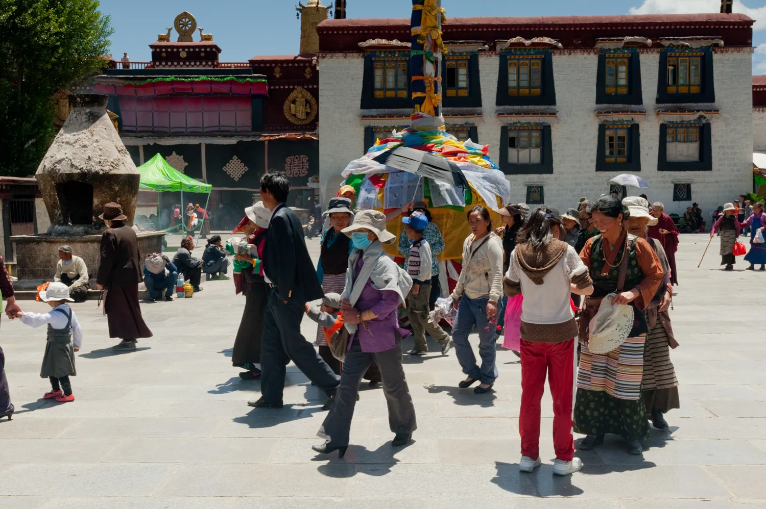 Jokhang Temple in Lhasa, Tibet. Pilgrims gather at the heart of Tibetan Buddhism, the Jokhang Temple (also called Jokhang Monastery). This is Barkhor Square, which fronts the holy temple.
