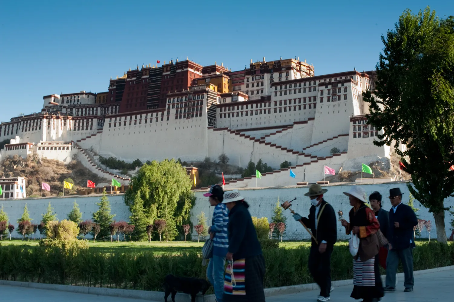 The Potala Palace and grounds glow in the sunlight as Tibetans do their morning kora (circumambulation). The Potala Palace is the symbolic seat of spiritual and administrative leadership of the Dalai Lamas of Traditional Tibet.