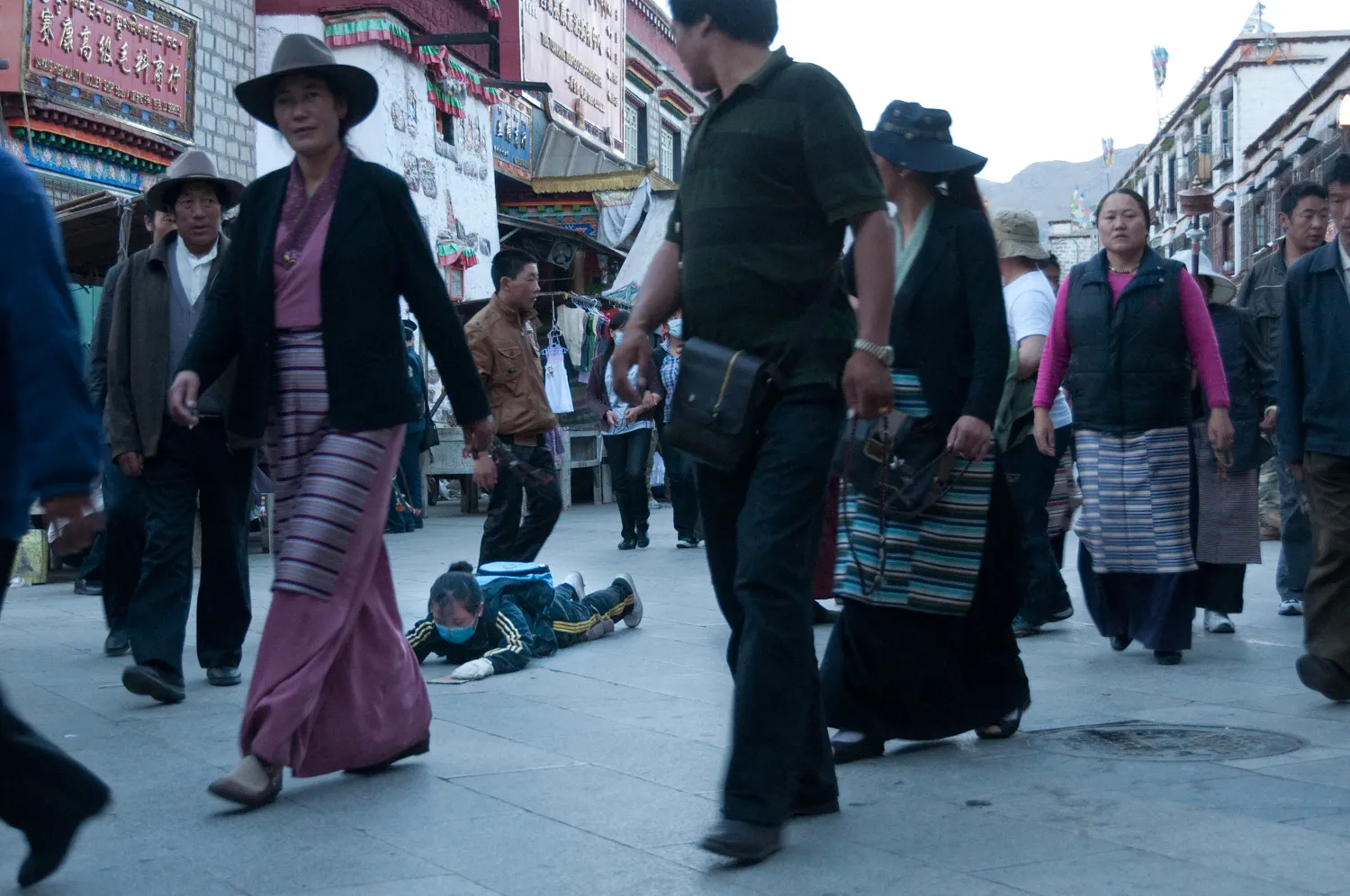 The Barkhor Kora. Sidestreet alleys, vendors, pilgrims in full-body prostrations, are part of the vibrant urban kora around the Jokhang Temple.