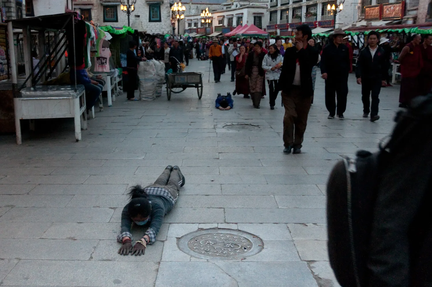 Full-body prostrations at the inner lane of the Barkhor Kora
