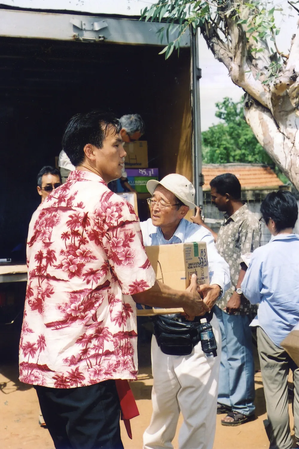 Dwight Oda and Gerald Nakamura help unload a truckload of clothing, toys and school supplies at a school in Vavuniya.