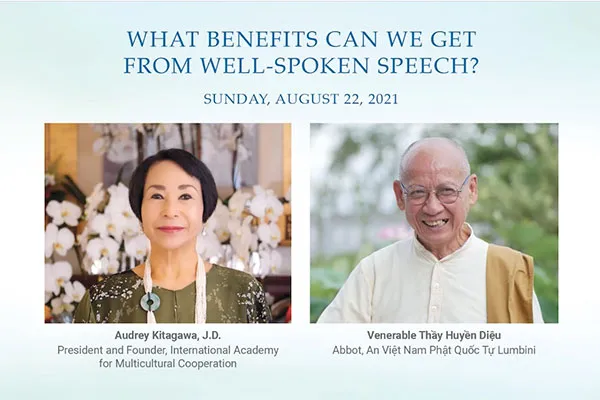 On August 22, 2021, Divine Mother was featured in an on-line discussion on “What Benefits Can We Get From Well-Spoken Speech” hosted by Venerable Thầy Huyền Diệu, head of the Vietnam Bouddha Bhumi Vihar in Lumbini, Nepal, birthplace of Lord Buddha.
