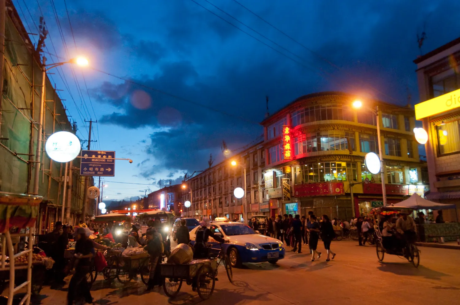 The Old Town of Lhasa at nightfall. The Old Town Project in the late 1900’s preserved a few of the old Barkhor neighborhood historic buildings. The Lingkor Kora encircles the old city of Lhasa.